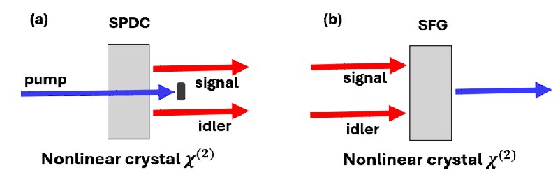 Sum-Frequency Generation (SFG) is an ideal tool for this. As the reverse of SPDC (Fig. 1), SFG requires both photons to arrive simultaneously at the crystal, effectively acting as an ultrafast coincidence detector for t₁ − t₂ ≈ 0. Furthermore, it annihilates both photons to create one new photon whose frequency is the sum ν₁ + ν₂, which can then be measured precisely.